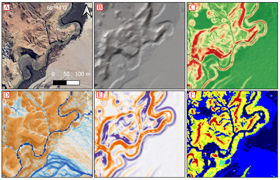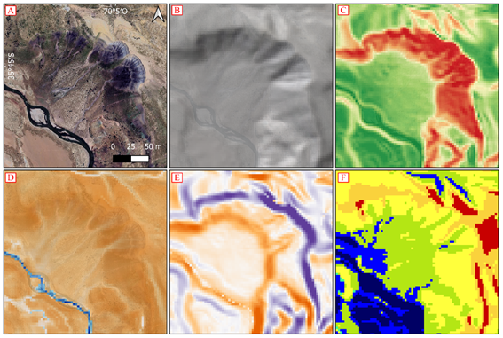 Figura 10. Morfometría de un abanico aluvial. A) Imagen de Google Earth Pro, B) Mapa de sombras, C) Pendientes, D) ITH, E) Curvatura en perfil, F) Geomorphons.