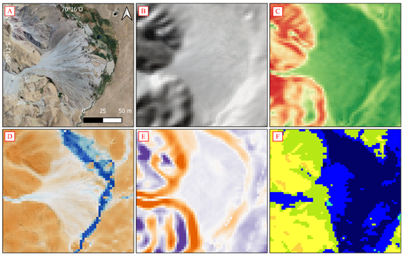 Figura 8. Morfometría de geoformas glaciares y periglaciares. A) Imagen de Google Earth Pro, B) Mapa de sombras, C) Pendientes, D) ITH, E) Orientación de laderas y F) Geomorphons.