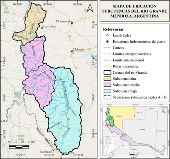 Figura 1. Localización del área de estudio: subcuencas de la cuenca del río Grande dentro del sistema del río Colorado, Mendoza, Argentina.