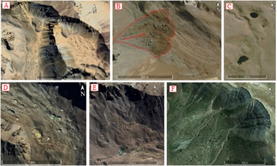 Figura 3. Geoformas glaciares, periglaciares y de remoción en masa (Google Earth Pro). A) Circos glaciares con glaciares de escombros y lóbulos de soli-gelifluxión, B) Avalancha de rocas sobre glaciar cubierto, C) Cubetas, D) Glaciar cubierto con glaciar de escombros y desarrollo de superficies de soli-gelifluxión y E) Glaciares de escombros activos e inactivos con lagunas glaciares aguas abajo., F) Cicatrices y flujo de detritos.